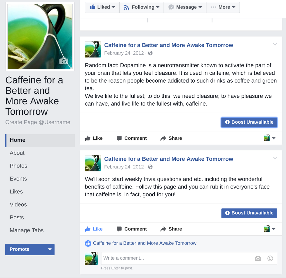 I've been drinking caffeinated drinks since I was six years old. Nothing too bad, just a cup of green tea every few days. By middle school, I had to drink two thermoses of tea every day just to stay awake. My best friend at the time noticed and told me I should stop drinking so much caffeine; I retaliated by making a Facebook page titled "Caffeine for a Better and More Awake Tomorrow."