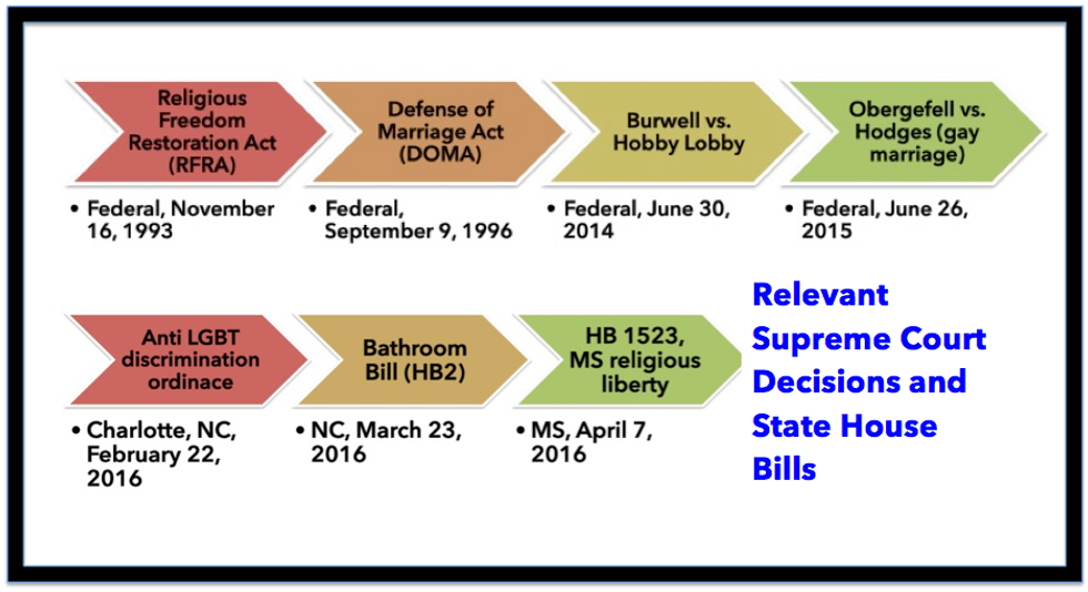 The Religious Freedom Restoration Act (RFRA) and Defense of Marriage Act (DOMA) are older legislation that have fueled recent events. Burwell vs. Hobby Lobby used RFRA in 2014 to win its case while Obergefell vs. Hodges overturned DOMA in 2015. The dramatic increase in "religious freedom" bills may have a correlation with the fact that we are going into an already turbulent election year with those two decisions fresh in our minds.