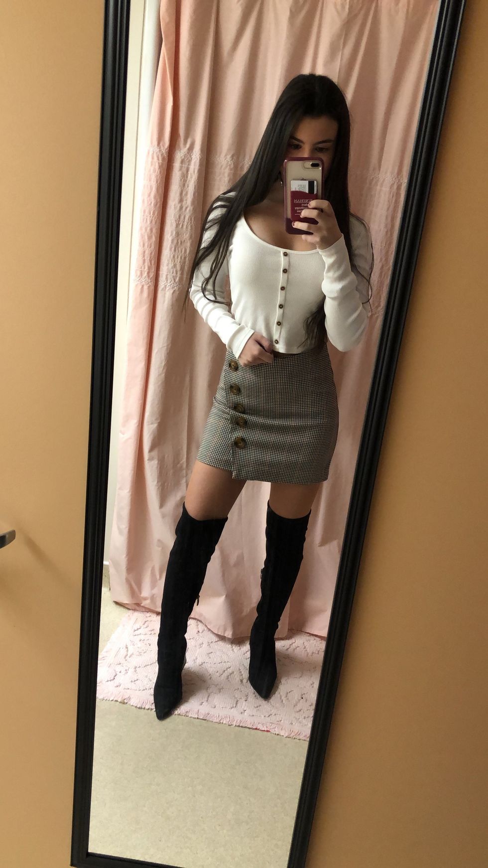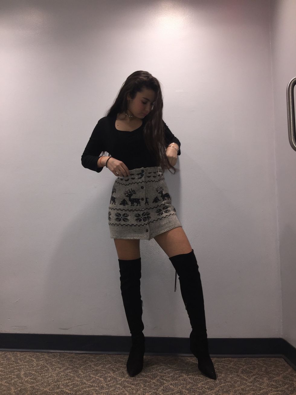 Just because it's cold doesn't mean you can't wear a skirt. One of my favorite looks is a skirt with thigh-high boots, which shows a little bit of skin above my thigh but keeps me staying warm in the cold weather.