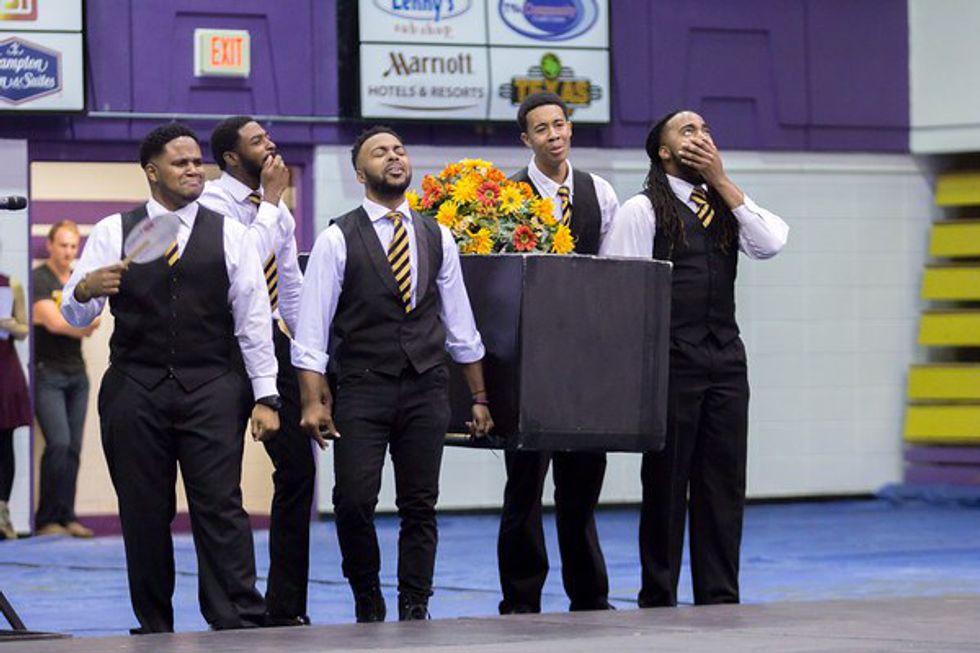 Next in line came UNA’s Alpha Phi Alpha, a first-time competitor in the annual step show competition, although you couldn’t tell by watching them perform. The newcomers entertained from beginning to end. What they lacked in numbers they made up for in showmanship, telling the story of “Death at a Funeral”, complete with both pastor and cardboard casket. APA left the crowd feeling thoroughly entertained as the next crew took the stage.