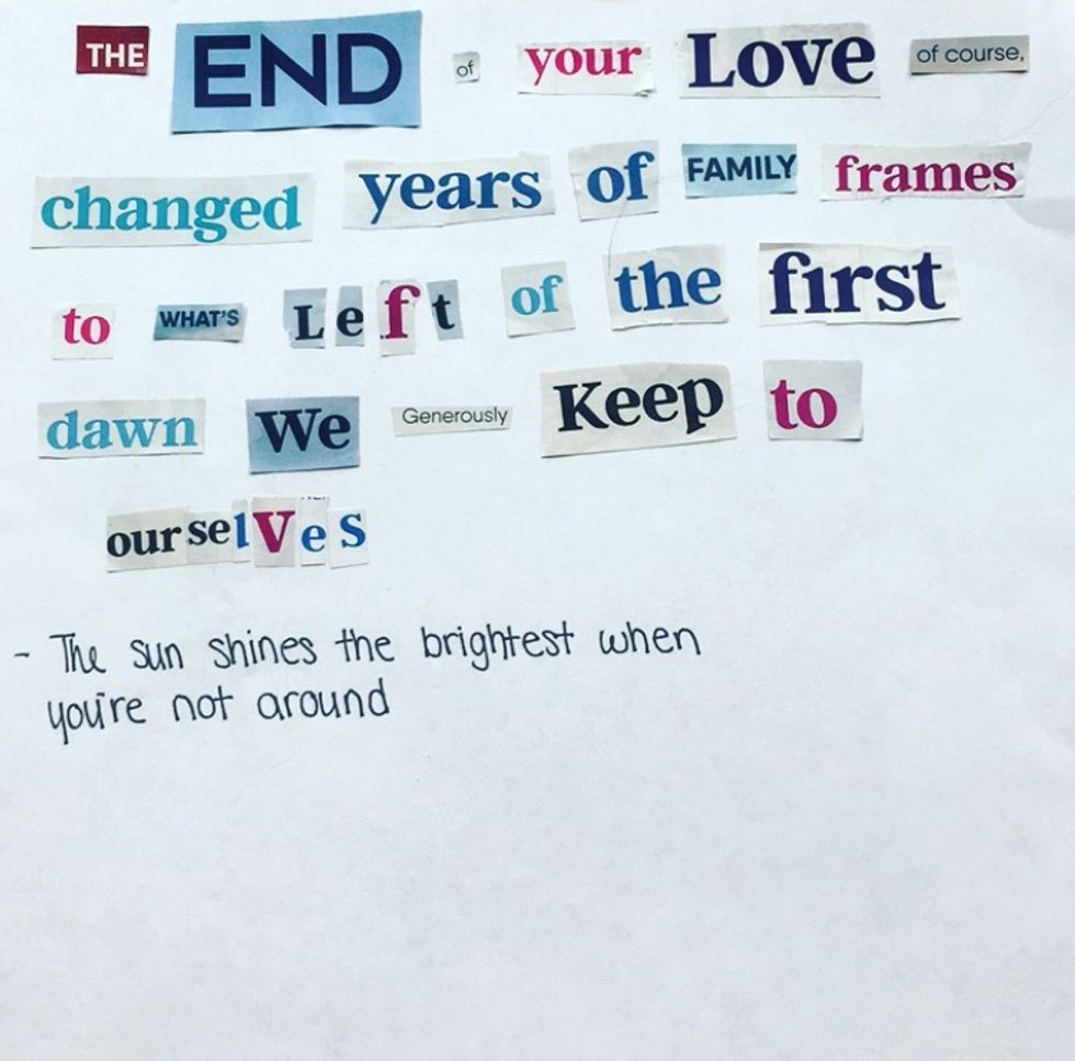 This method is a cheaper alternative to the magnet poetry kits while being eco friendly as well since you can recycle the paper when you're done. In my opinion, this technique is more advanced than blackout poetry because of a broader language spectrum to choose from. The level of difficulty really just depends on who you are and whether you write better when given an open canvas or when following strict rules. Nonetheless, magazine collages are still a great opportunity to open yourself up and test what you're capable of when given unlimited potential for your writing.