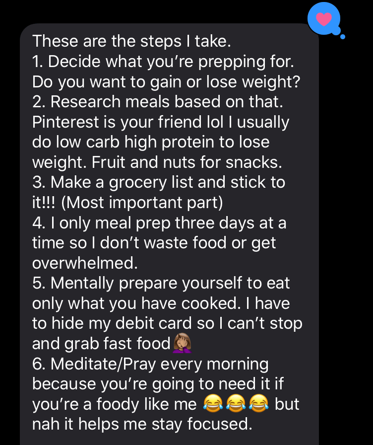 A discussion on twitter turned into a full tutorial on how to meal tackle meal prep. When my friend tweeted about starting to meal prep again, I expressed the stress I had with my attempts. Next, she texted me and said some of the best things I've ever heard and she had an entire list of steps.