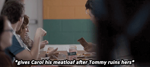 Almost subconsciously, he gives Tommy his applesauce and wordlessly forks over his meatloaf to Carol when Tommy destroys hers during some "comedy" bit. The Mom Friend that emerged in season two had been there all along. He's naturally nurturing.