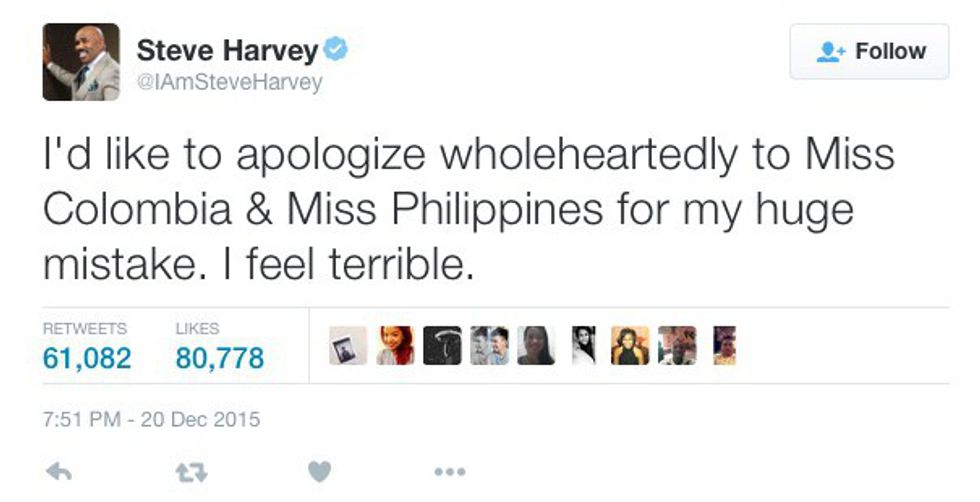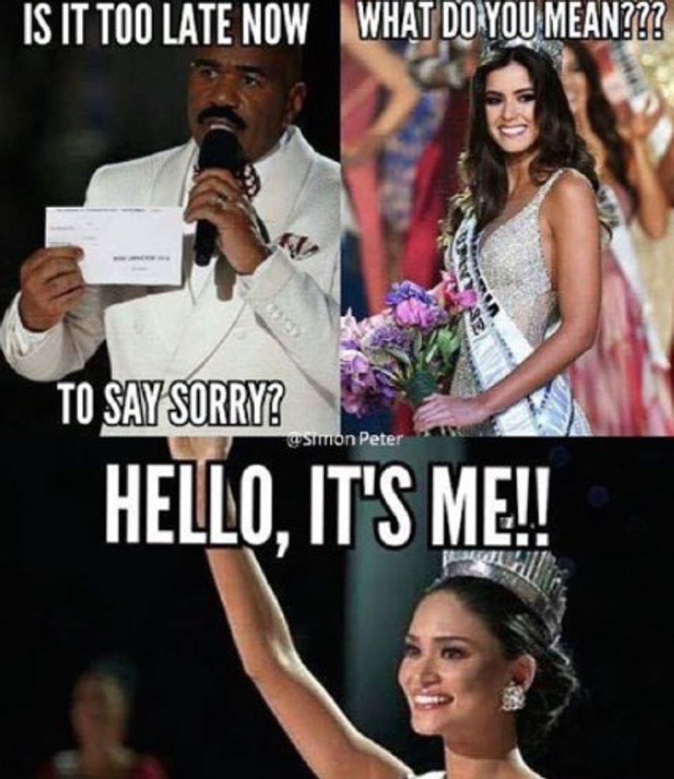 Miss Universe 2015 got extremely awkward after host Steve Harvey crowned the wrong candidate. Miss Colombia, Ariadna Gutierrez, was announced as the winner of the nationally televised beauty pageant, but the winner was actually Miss Philippines, Pia Wurtzbach. Nearly five minutes had gone by after Miss Colombia was announced before Harvey came back on stage and said, "I have to apologize, the first runner-up is Colombia."