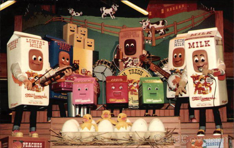 The animatronic milk cartons are my favorite things from my childhood, hands down. I always wanted to be the chocolate milk playing the drums. (Note the chorus of butters in the back.)