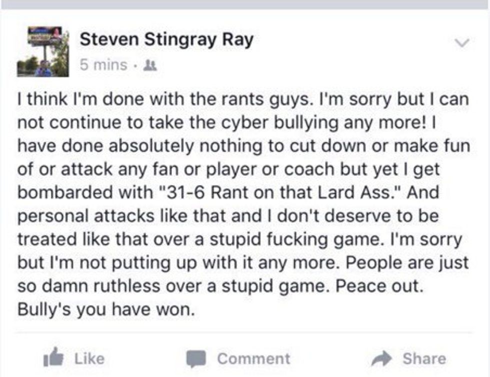 However, as with everything, the internet found a way to ruin it. After a devastating loss to rival Alabama, internet haters decided to go after Stingray to such an extent that he decided to call it quits. That was it, one of the last great things we had to look forward to each week was gone because people just have to put hate out into the internet.