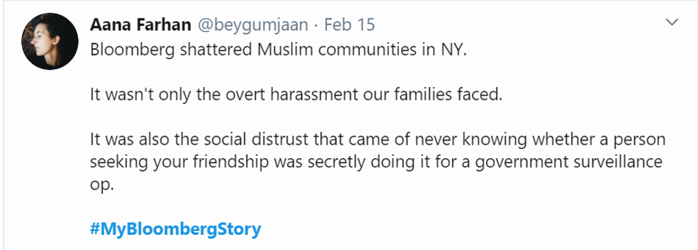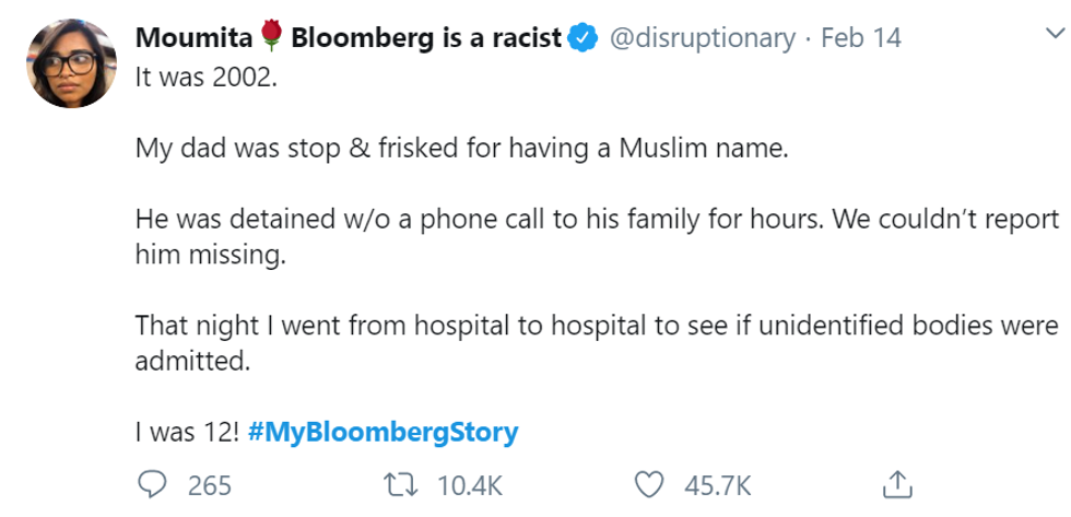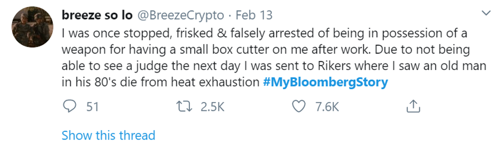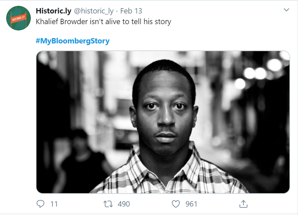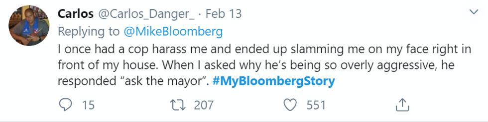 Users on Twitter began to share stories with the hashtag #MyBloombergStory in retaliation to Bloomberg's recent comments about his history with stop-and-frisk. Each story highlights how nonwhite residents of New York were targeted and mistreated by the NYPD, which was under Mayor Bloomberg's oversight during his time as mayor.