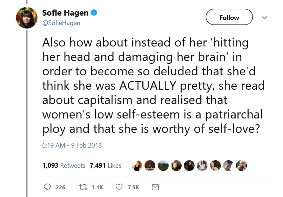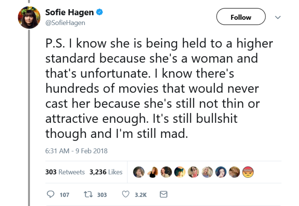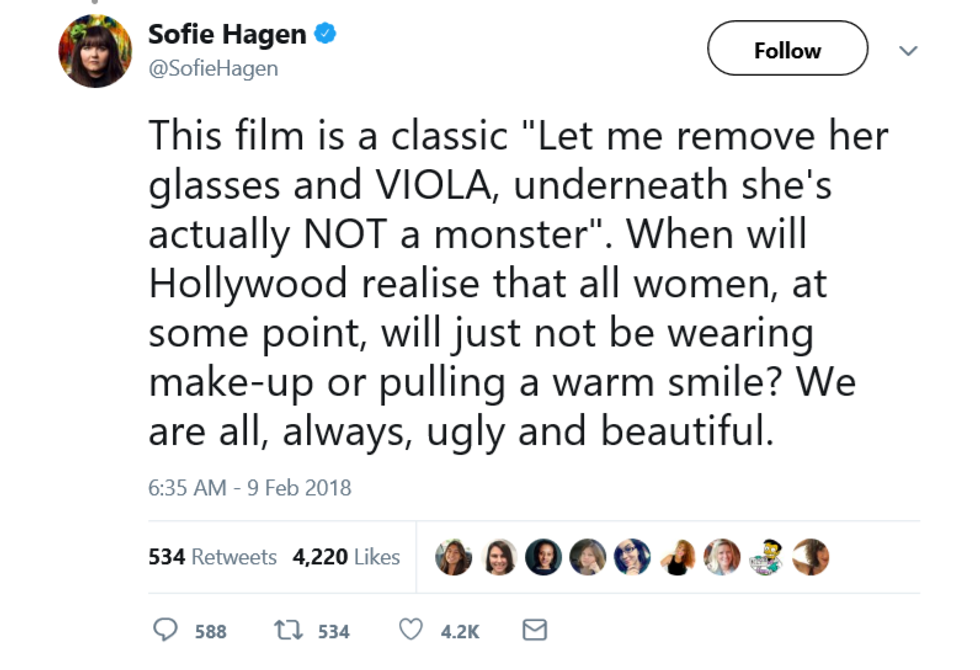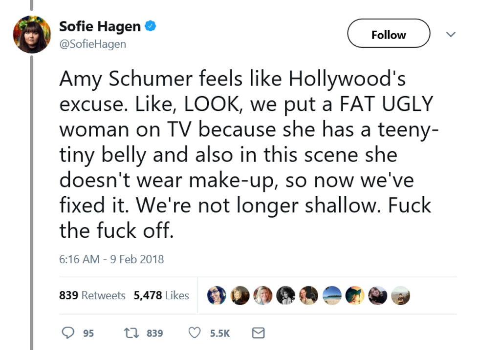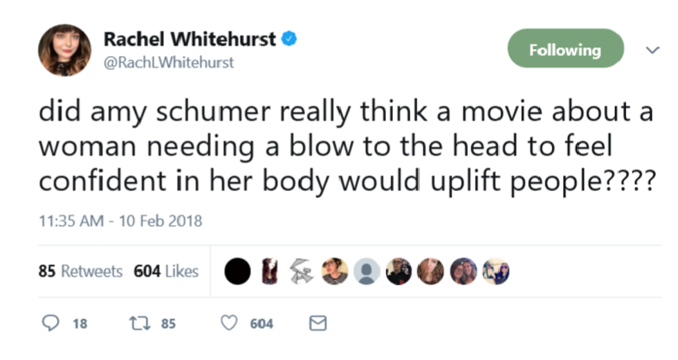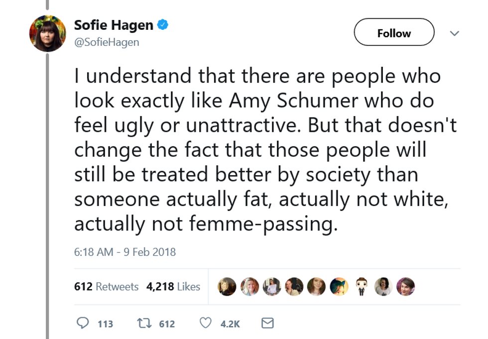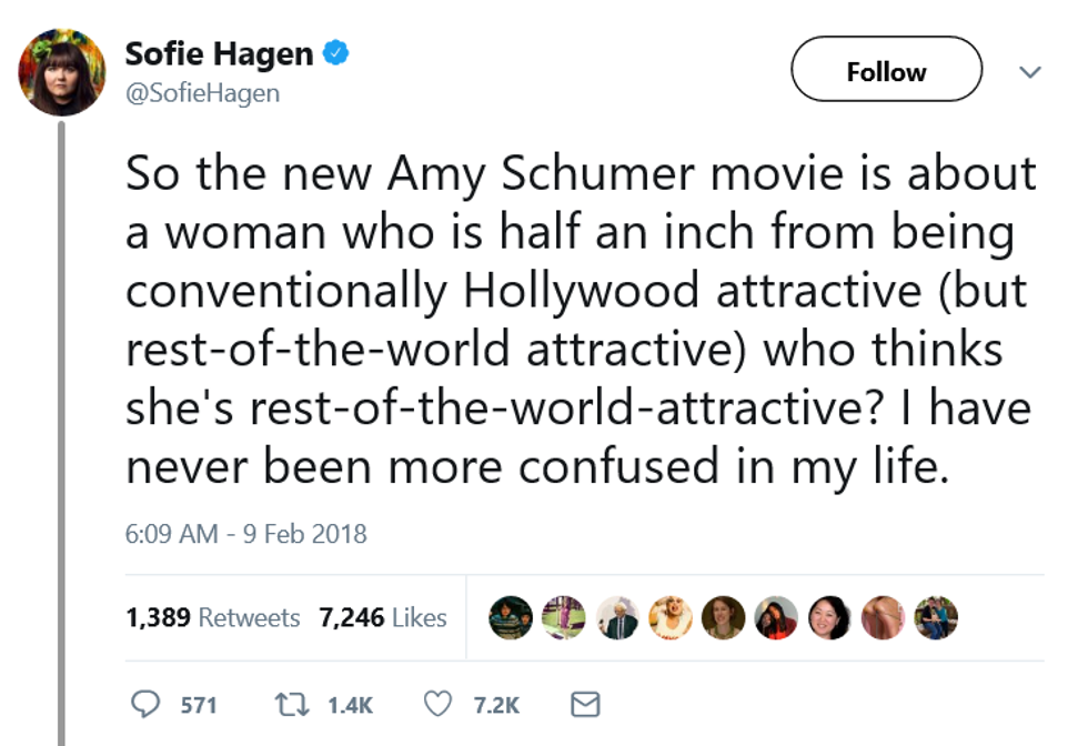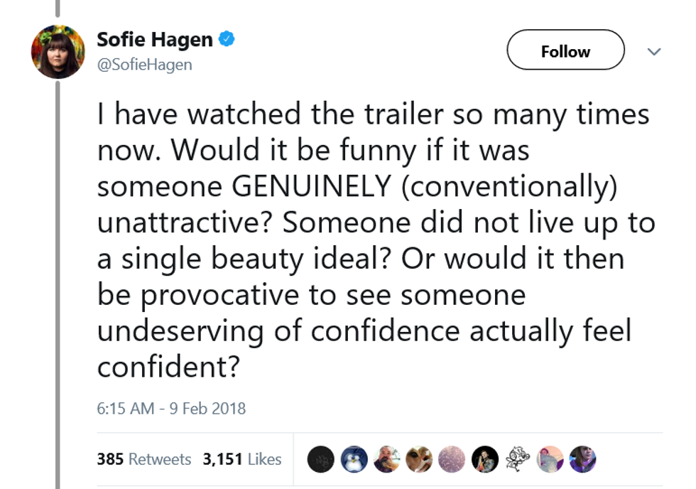 (Comedian, Sofie Hagen)The gist of Hagen's Twitter thread was basically that "I Feel Pretty" was massively offensive, mainly due to the fact that the subject of the movie is not an absolute troll and, therefore, shouldn't have ever lacked confidence in the first place.