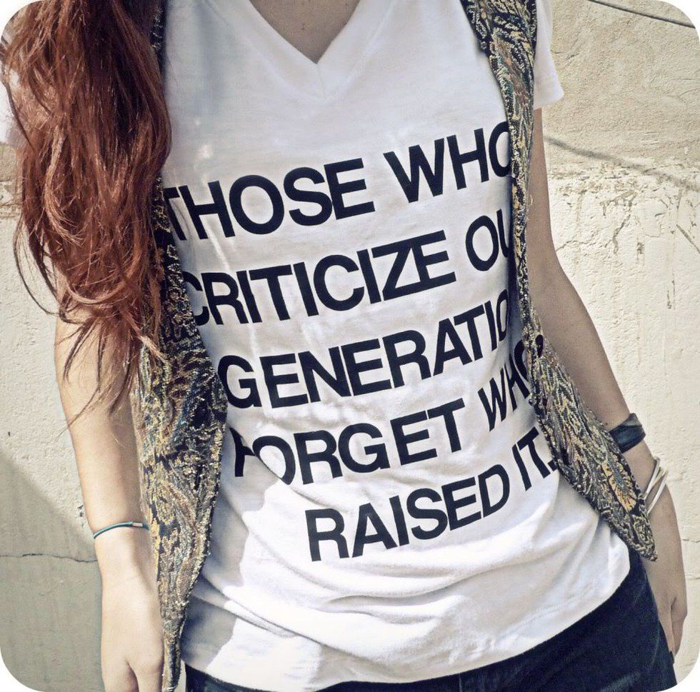 I see a lot of those artistic quote pictures floating around online. One states dramatically, "Those who criticize our generation forget who raised it."