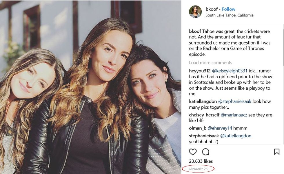 This was posted on January 16th, so just a mere five days after the breakup. And she's having a wine night with her girls and referencing "The Bachelor". Obviously, she has to do these types of posts for the show, but in light of everything, one would think if she was truly hurting as she should be, then the network would cut her a break as far as social media sharing goes.