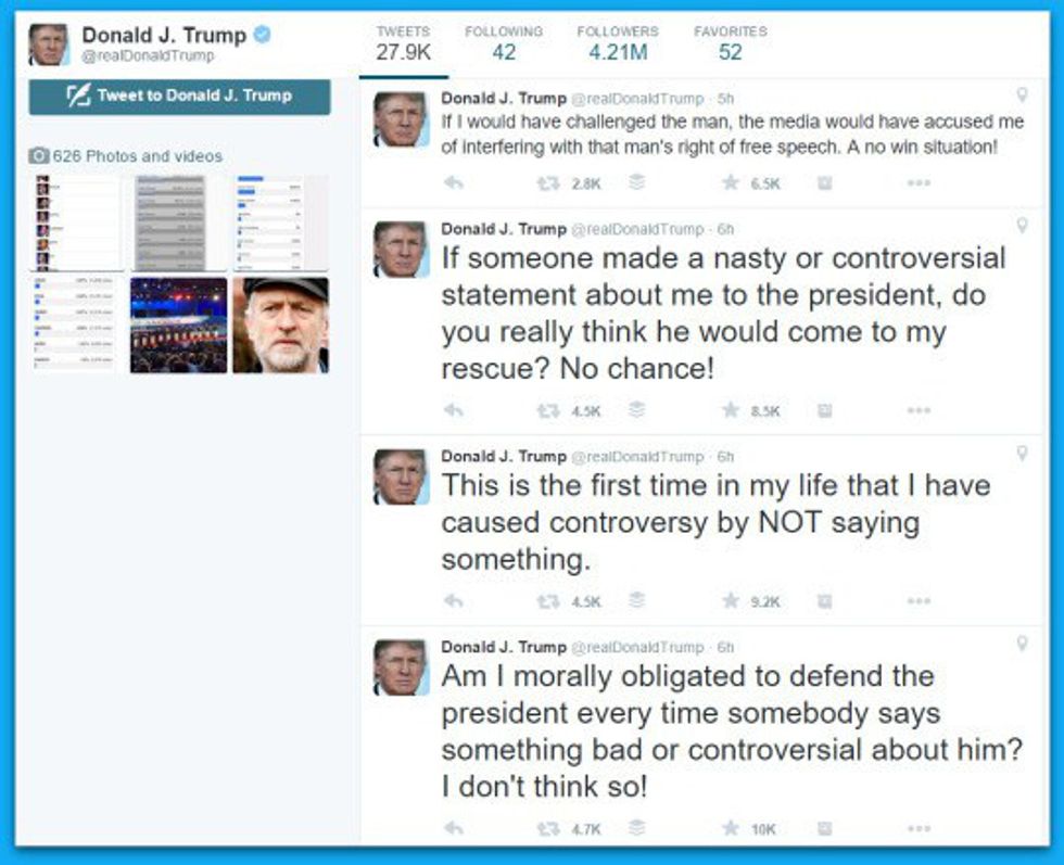 Trump lets this crap happen and then even gets on Twitter like a child when people get upset with him for not defending Obama. He goes on a tweeting spree like a middle schooler and you expect this man to handle our country? He can't even handle himself!
