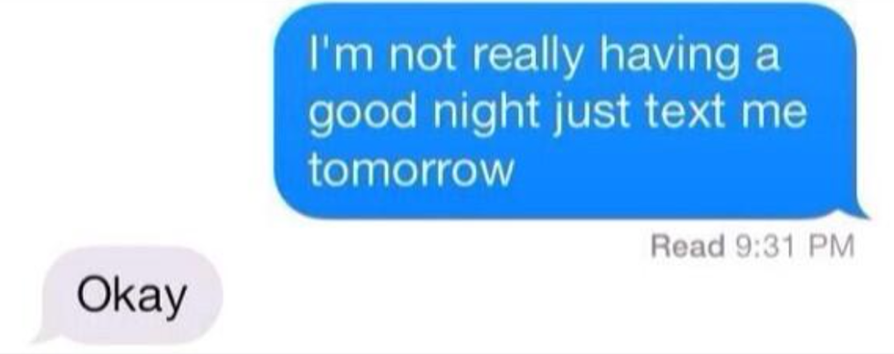 And also, your partner is not a mind-reader. I gotta ask: why aren't people just straightforward? If you want your partner to keep texting you, FREAKING TELL THEM AND STOP THE MIND GAMES. It really sucks how you have to question what a person's words really mean, and have to wonder if they're "testing" you and expecting to take their hint.