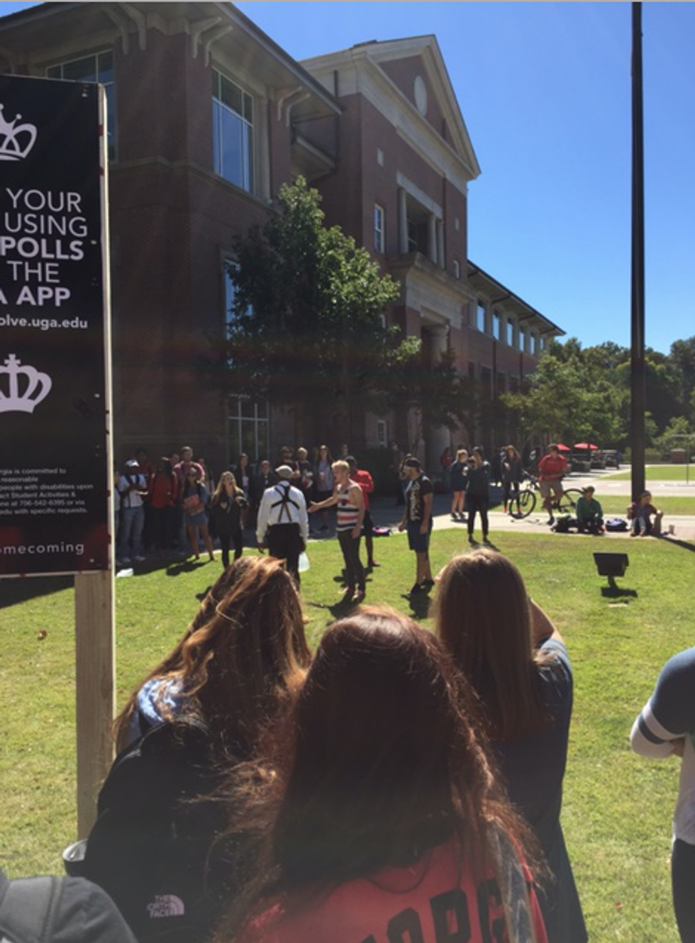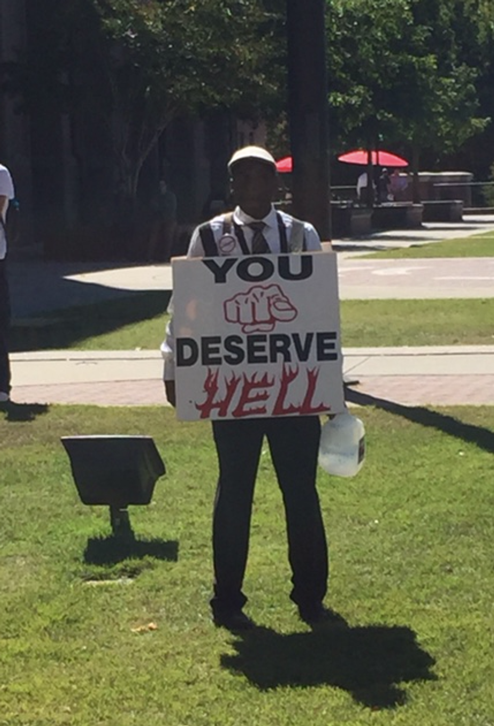 On Monday and Tuesday of this week, a middle-aged man has camped out in the middle of the grass between the Tate Center and the Zell B. Miller Learning Center (MLC for short) with signs and a gallon of water with a rowdy crowd circled around him. Today, I decided to just “go check it out” and see what all the fuss was about. Just seconds into his current rant, I got heated. A few minutes turned into thirty and I found myself really pissed off.
