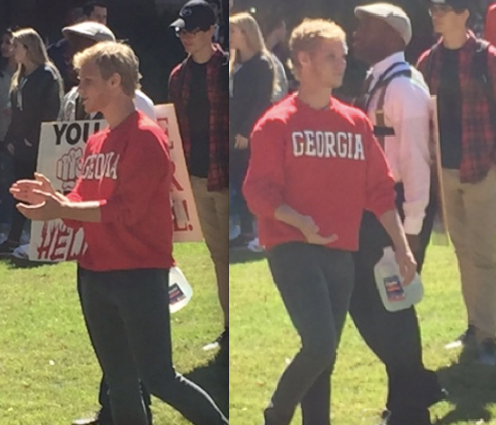 One student – wearing a bright red Georgia sweatshirt of course – promptly threw his belongings into the grass, shouting rebuttals as he strutted into the middle of the circle, inches from the man’s face