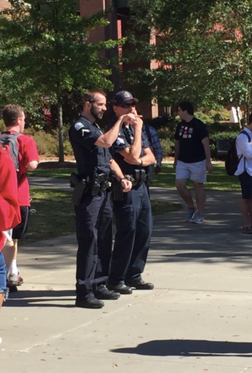 But after speaking to one of the cops who eventually arrested this man for “assault of a student” (apparently he tried to punch the student in the red sweatshirt), he told me that the organization that this man is with is purposefully coming to free speech campuses and locations around Georgia to evoke physical assault on himself, giving him the ability to sue the school.