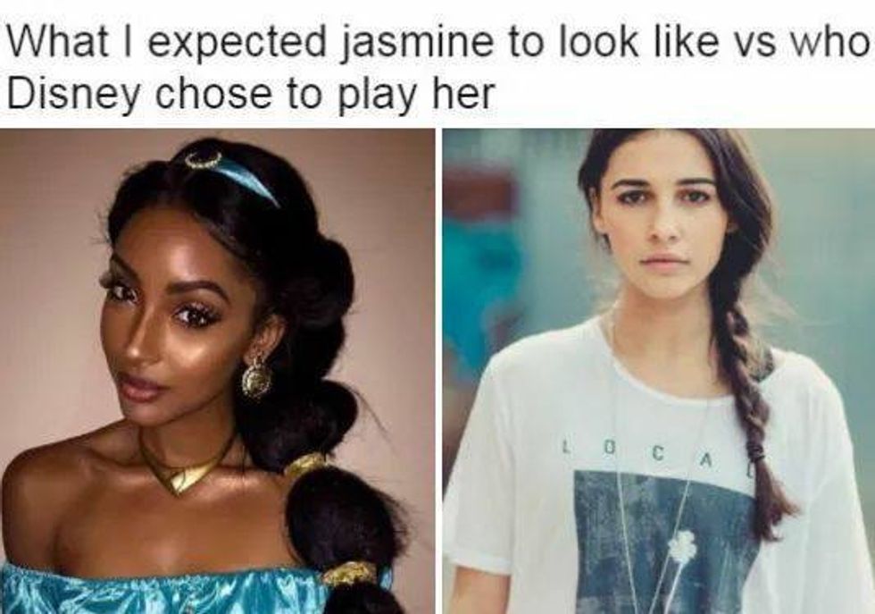 That is the beauty of the industry. The film industry is an artform and it will blow your mind by what they can achieve. Naomi is of Indian decent and therefore her skin is extremely close to Jasmine's. India is home to a portion of Arabic's within its population, although it is not an Arabic country. Of course, her skin is not going perfectly match an animated character. When you go to a Disney Park and meet the characters, their skin tones are not a perfect match because the animated characters were colored in. I saw an image on Facebook (as seen above) stating that the woman on the left is what Jasmine should look like. Well obviously, the image on the left is a cosplay and the image on the right is of Naomi with a filter. Also, the woman on the left is clearly African American and NOT Arabic.