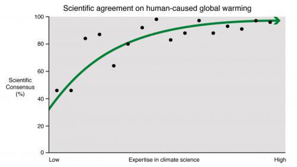 What this graph says: the more you know about how the climate works, the more likely you are to agree with the idea of human-caused climate change. In fact, 95 percent of climate researchers agree. On the other side of the spectrum, corporate spokespeople are often fighting the notion. These corporations are often making money in areas that would lose profits if proper preventative measures to combat climate change were to occur.