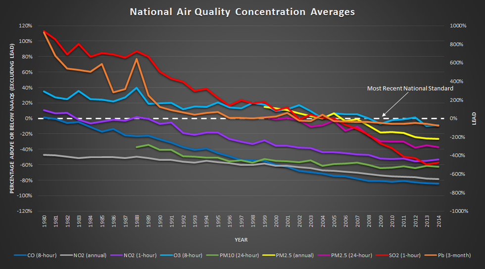 To simplify this graph, the average concentrations of air pollutants such as lead, carbon monoxide and sulfur dioxide in our breathing air has decreased over time. What caused the decrease? Some ridiculous people have ridiculous answers, but the most obvious answer is our increasing air pollution regulations.