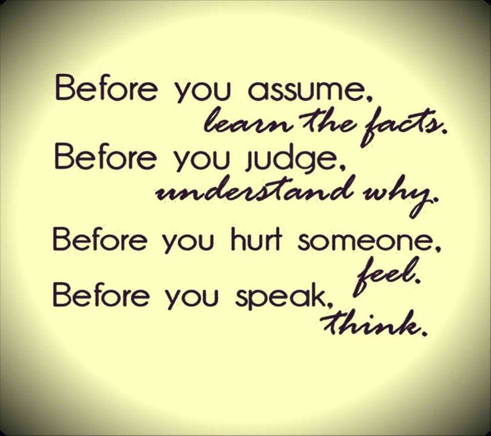 So the next time you or your friends judge someone, think twice. "Maybe I shouldn't do this because it's going to make them feel bad and it's not right to treat people that way." Maybe instead of judging someone, you could get to know them and be their friend. There are so many people who don't think before they say some things which can hurt another in the long run. Even just a whisper about someone can hurt because odds are, they can hear what you say. Put yourself in their shoes, if you don't want to be judged, then why do you think it's alright to judge others? That's the question, it's like treat people the way you would want to be treated. So if you don't want people to judge you, then don't judge them!