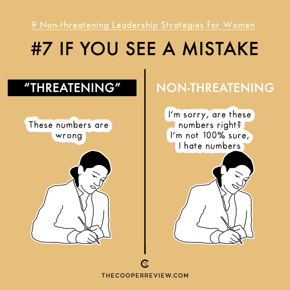 For me, experiences like this one slide into the category of “Little Moments of Internalized Sexism,” things that seem so quotidian that they would be easy to miss if you weren’t looking. I was reminded of a comic by Sarah Cooper that I read recently, detailing the lengths that female leaders go to in an effort to seem nonthreatening. I was not shy. I was not unsure of myself. I wasn’t wrong. But I was nervous to speak up because I was worried that my own knowledge would be dismissed as not being good enough. Worse still, I might be labeled— bossy, pretentious, know-it-all.