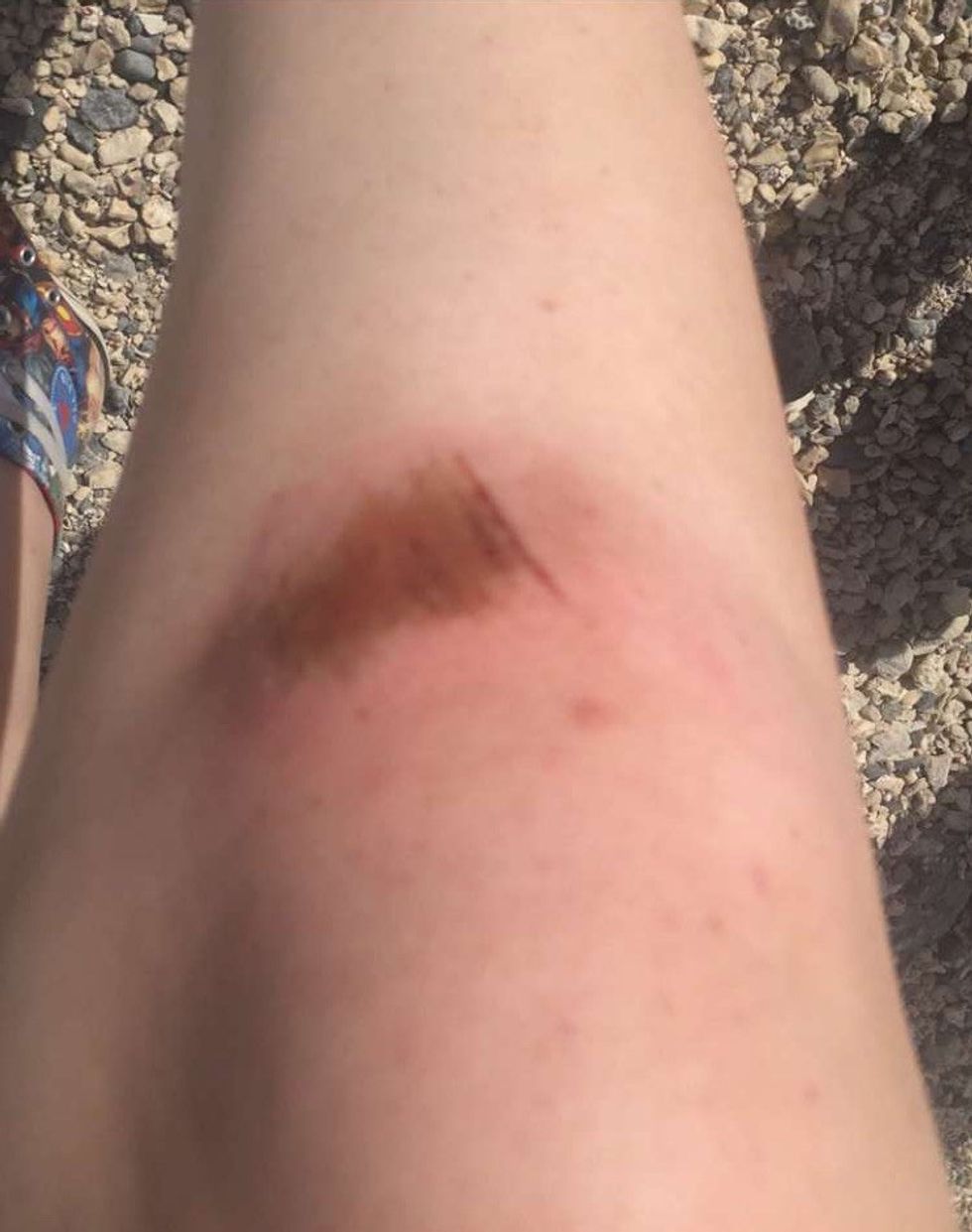 Now, I am not a sporty person. When we started I knew that I was going to be near the back of the pack, and then my mom slipped and fell on the sand. I laughed about it, but not five minutes later I was the one that fell. But I fell on my knee and I started bleeding. Here's what it looked like by the time we made it to the pool: (if you're super, super squeamish, you might wanna skip it.)