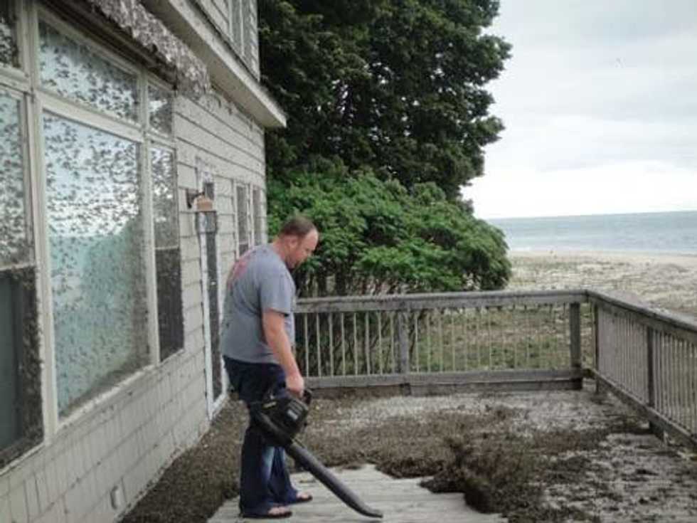 Spoiler alert! Mayflies do not leave anything easily, not even when they are being blown by leaf blowers. We quickly discovered that they fall onto their sides, their wings shine, and you have to be within six inches of them for them to detach.
