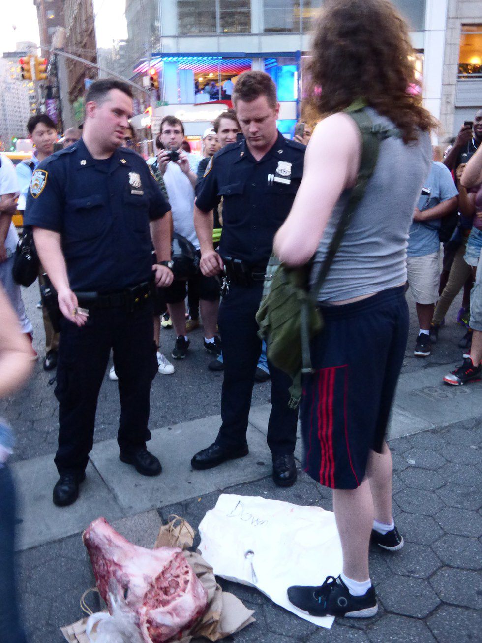 Union Square, New York City: full of tourists, angry honks, religious chants, break dancers, bustling shoppers and… anti-vegan protesters eating cow brains?
