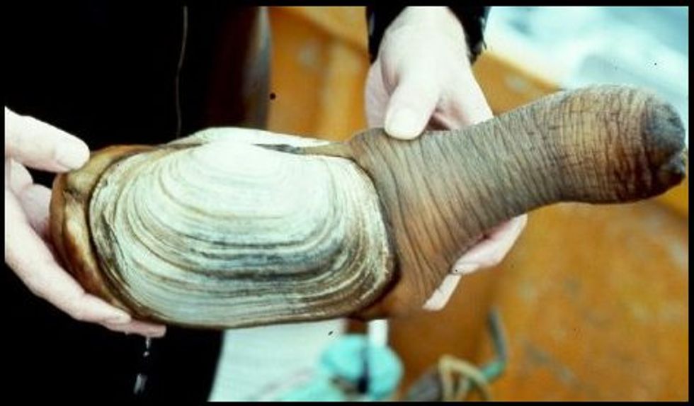 When I first heard this one I wondered what in the hell is a geoduck? I thought maybe it was some weird type of duck but oh boy was I wrong. The definition of a geoduck is a "Giant mud-borrowing bivalve Mollusk occurring on the west coast of North America, where it is collected for food. Its shell valves are not large enough to enclose its body and very long siphon."