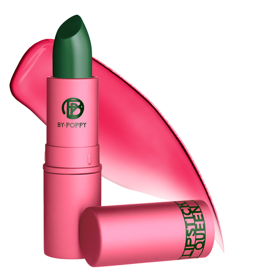 This lipstick is a deep forest green in bubblegum pink packaging, but when this product touches your lips, it will transform like the damsel in distress kissing her frog prince. The green turns into a beautiful rosy pink. This lipstick includes moisturizing properties and leaves a glossy finish. It will adapt to different skin tones, giving each person a customized color.