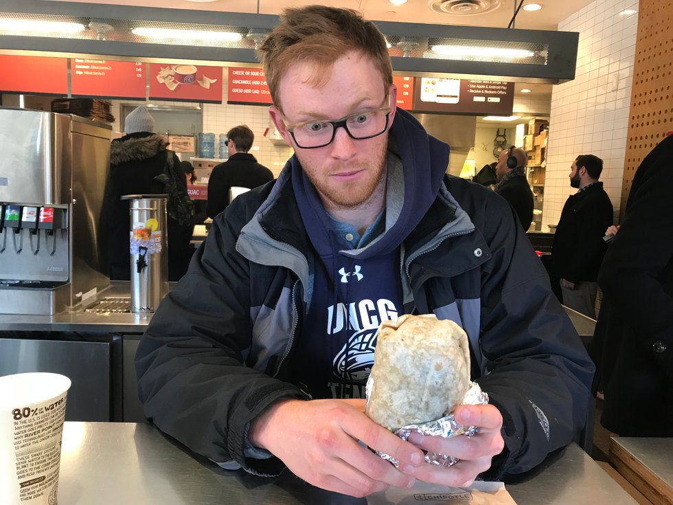 Beyond the forbidden-burrito-setdown, each bite presents its own challenge. With every nibble, a new, never before seen burrito biting situation arises. How do you take a bite so as not to lose any beans, corn or chicken? How do you avoid spilling any of the juice that has accumulated at the bottom on your hand?