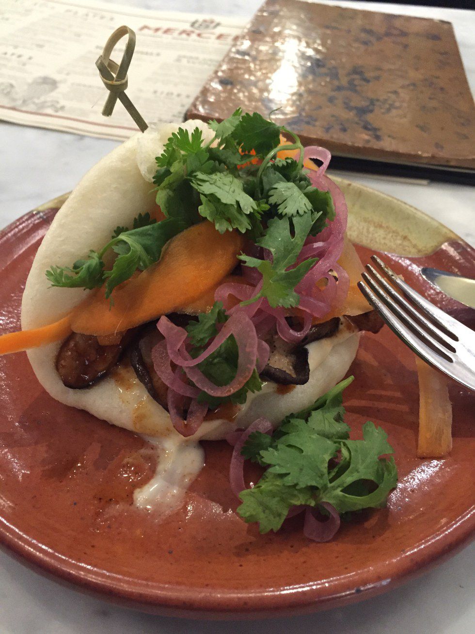 We arrived Saturday afternoon and checked into our hotel, the Mercer Hall Inn. Mercer Hall is a restaurant/beer hall on the main floor, with hotel rooms on their second and third floors. After seeing the play, we decided to eat there for dinner. We didn't have a reservation, but there was space at the bar for us to sit and eat. I'm trying to cut back on eating meat, except for fish, so my menu choices reflect that. For starters, I ordered the Grilled Mushroom Steamed Bun, which was really tasty. Along with the mushrooms, there was pickled onion, carrots, cilantro and a spicy aioli in the bun.