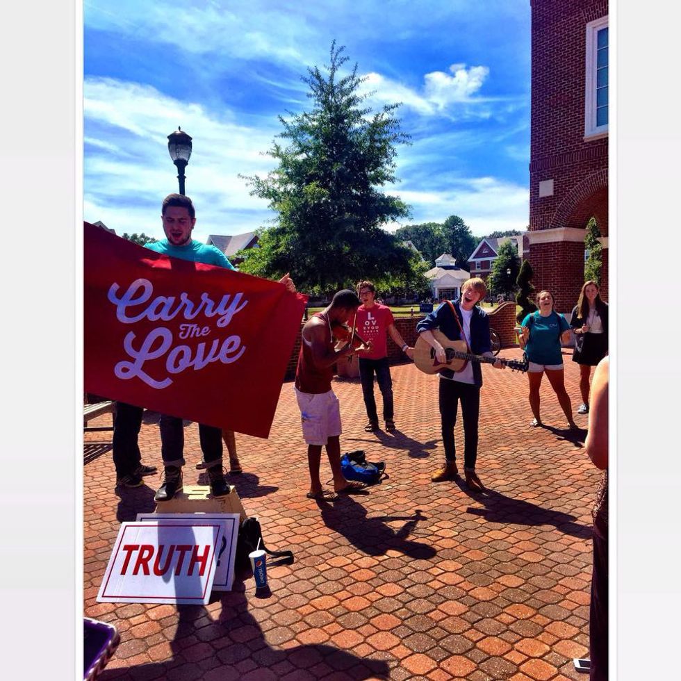 Instead, what happened was the peaceful coexistence of these two groups. Don Karns got to speak, and other ministries on campus shared their love for Jesus through worship songs. Spectrum held up "Share the Love" signs and rainbow flags, and talked to Captains on campus about love and acceptance.