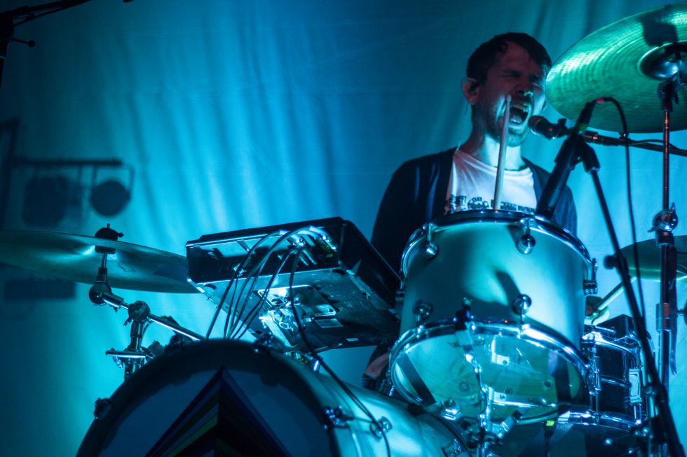 Josh Hodges, vocalist and multi-instrumentalist for the group, multitasking with percussion, guitar, and keyboards.