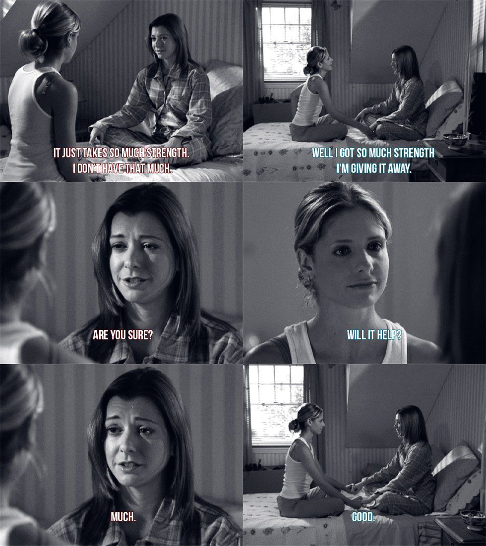 How often have you heard or read "I'm not like other girls"/"She's not like other girls" as if to be like a "normal" girl is a bad thing. Buffy doesn't buy into that shit, her friendships with women are just as important to her friendships with men. Often times we get the trope that a strong female character doesn't befriend other women because she's better than them, either that or other females don't exist in her world unless they are there to compete against her or for her to be compared against. The point is to bring women up, not step on them to show how much better you are than them.