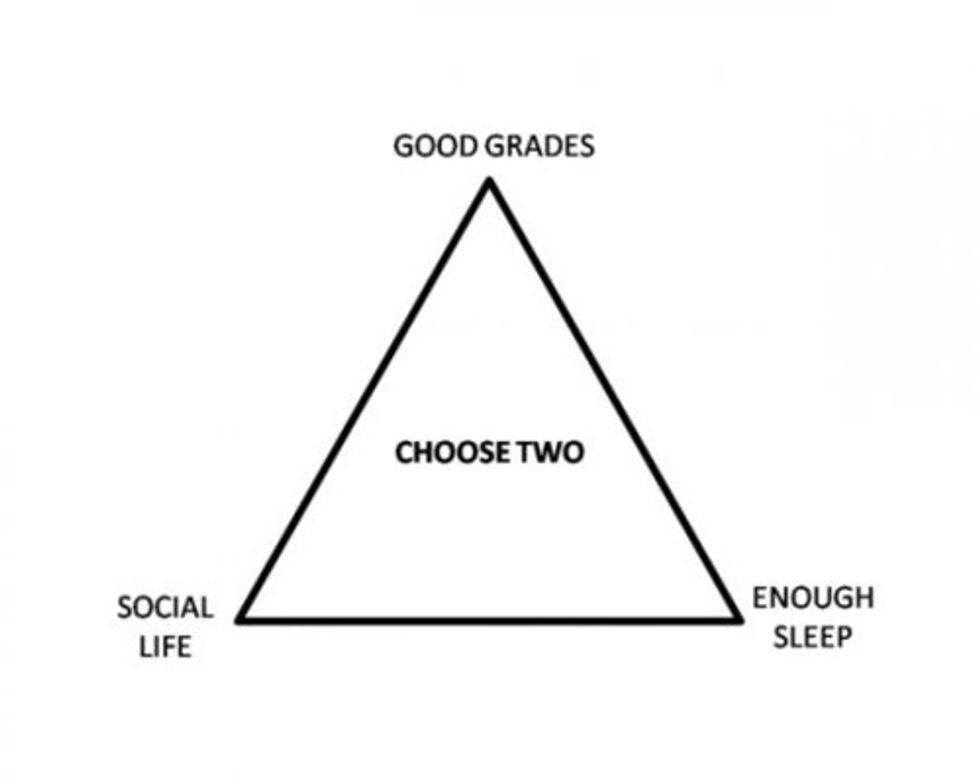 No matter how easy some people may make it seem, life as a college student is not easy. Being the perfect person and achieving everything in the “college life” triangle is not possible. All you can do is try your best. Find the balance between good grades, enough sleep, and a social life that works best for you, because once you do, things will become less stressful, and handling college life will seem much easier.