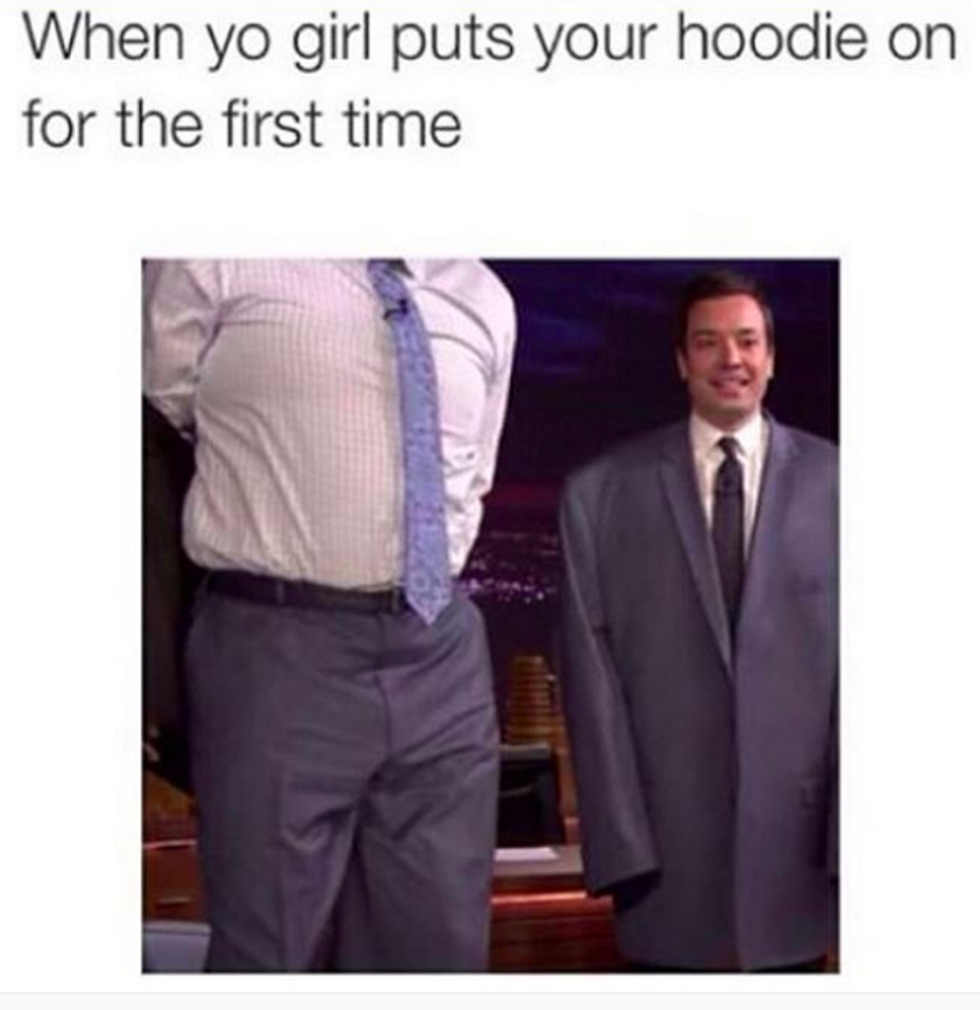 It's cute when girls borrow their boyfriends hoodies or sweatpants...unless you wear an XS and he's a L. Then it's not so cute when his t-shirts are dresses and your entire body can fit in his sweatpants.