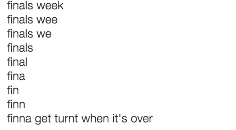We all know that finals week is the most dreaded week of all when it comes to a college student (well at least I know it is for me). It's not just the week where we have a whole bunch of last minute assignments (that we probably procrastinated on) and piled up exams coming our way, but when our life just seems to all fall apart. I don't know about you but my whole life seems to fall apart during that week. It's like it's a sign that is preparing me for finals week. It's the struggles of finals week.... as if finals are not enough to worry about.