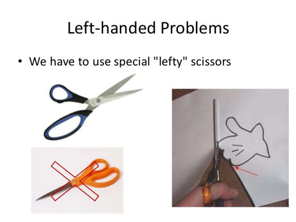 Historically, being left handed has been seen as "sinister" which originates from the Latin word "sinestra" which was the word for left. While the world has moved away from fearing left handed people and trying to force them to write right handed, but things are still being built and made for right handed people with few options for lefties