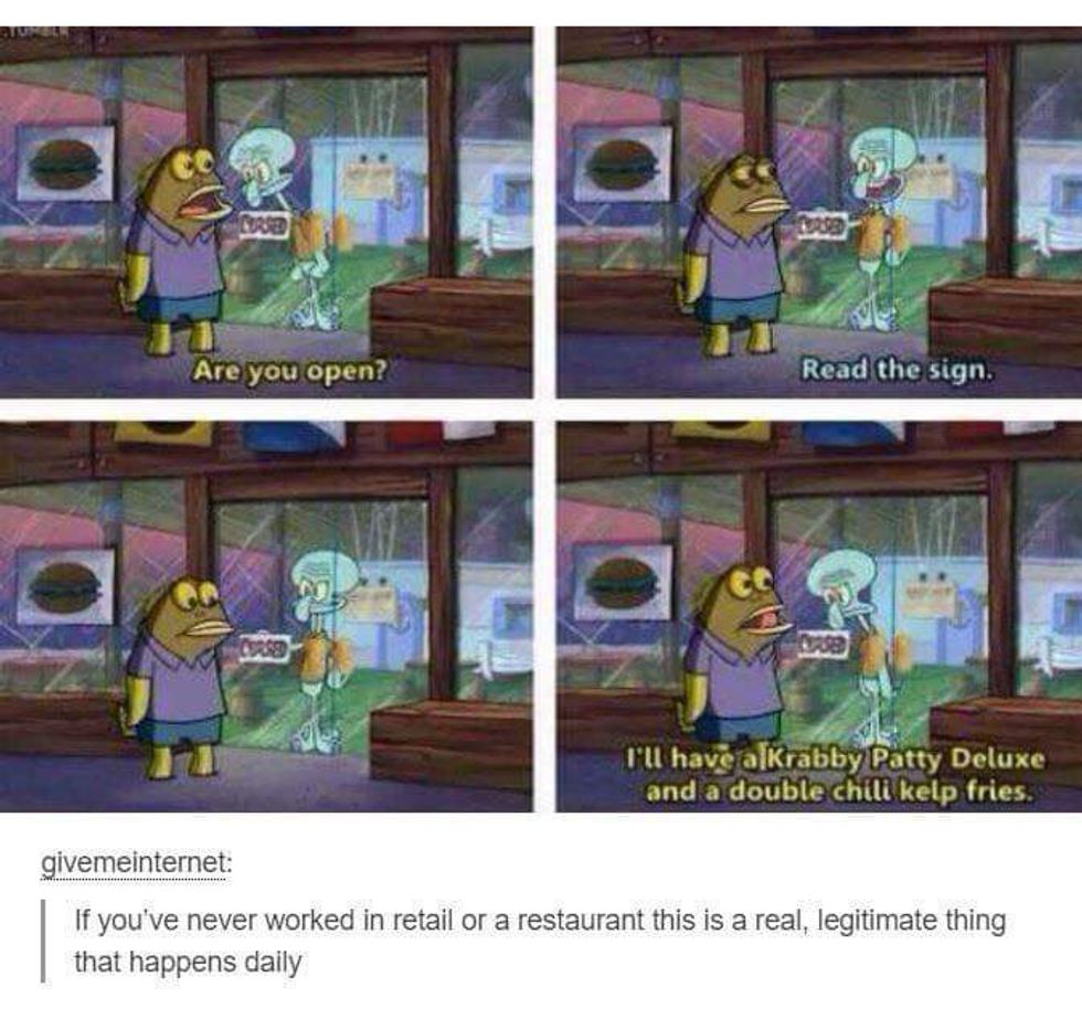 There are a large amount of people that work in the restaurant business. It's a good job to have, especially while going through school. However, it's not always sunshine and rainbows. Customers can be either the most awful human beings or so nice you never want them to leave. There are very rarely any in-between. They think all the job consists of is seating them and tending to their every need and that you should do this flawlessly and immediately. Here's everything you should understand before dining.
