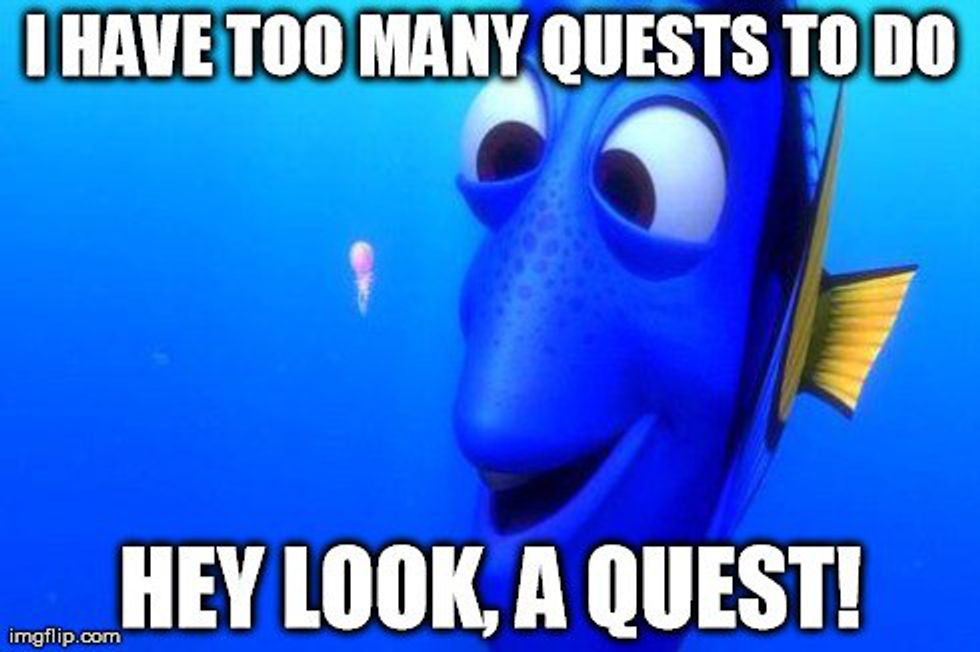 Well you just finished your full quest log of 12 quests and then you stumble into your next town. Your first sight is 56 golden question marks from quest givers...and then when you finish all of those, the cycle repeats itself and you add 13 more quests from your travels (refer to 2. again).