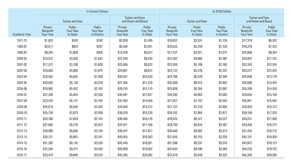 The cost of a tuition and room and board at a public four-year, in-state university was about $9,000 in 2001. In 2016, the same kind of university cost a little over $20,000.