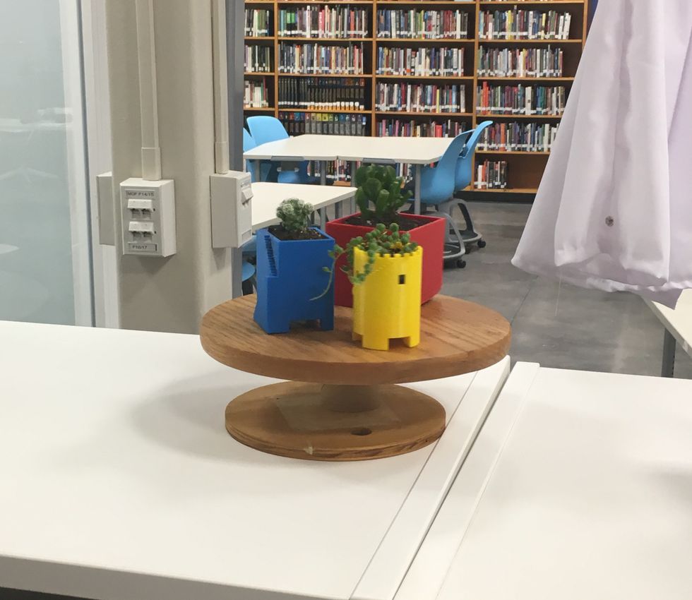This contemporary succulent display was mad by Olivia Katz. The containers were 3D printed and the turntable was made out of a lazy-Susan and a recycled microwave motor.