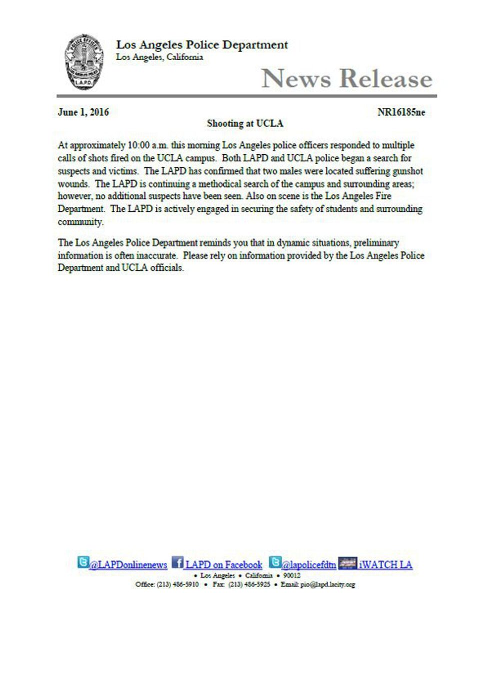 Along with the police, agents from the FBI and the Bureau of Alcohol, Tobacco, Firearms and Explosives arrived at the scene of the incident shortly after it occurred. Los Angeles Police Chief Charlie Beck has confirmed that there was no ongoing threat at the school after the shooter had killed himself shortly after noon. The police have located the weapon that was used. A citywide tactical alert was issued by the LAPD which required that the shifts of the officers on duty be extended. There are currently no suspects at large for this case.