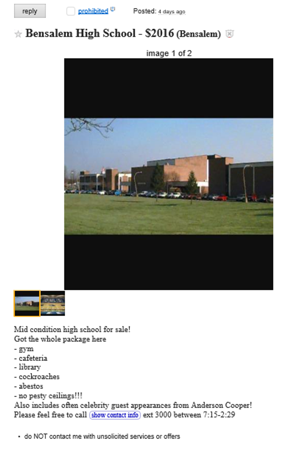 Senior Pranks have been traditions throughout America's high schools for a long time. They usually include covering cars with plastic wrap, water balloon and water gun fights, releasing animals in the school, dropping 1000s of little bouncy balls across the hallway, and even covering a school in police tape. Students at Bensalem High School took it to another level. They published the Bensalem Township School District Senior High School for sale on Craigslist for $2,016.