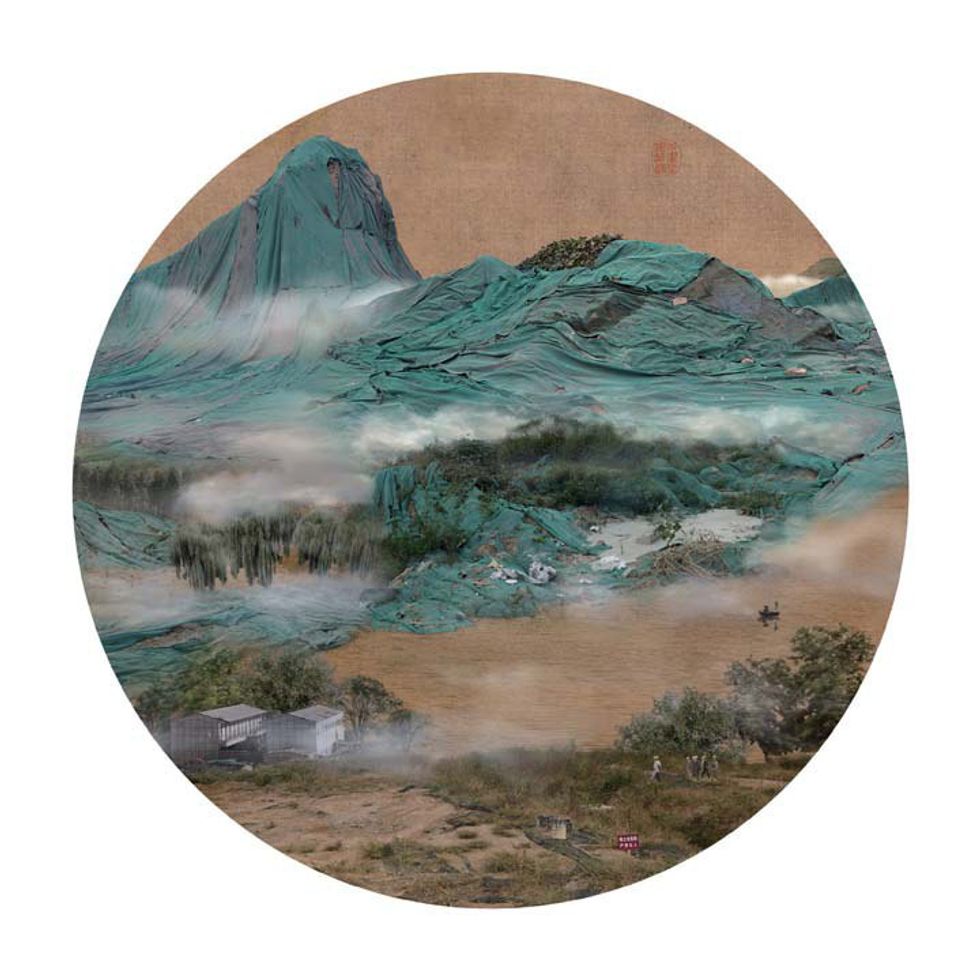 Yao Lu is an artist and photography professor at the Central Academy of Fine Arts in Beijing. Lu’s work, created from photographs taken by Lu and then reassembled using digital technology, seem far from the idyllic paintings and prints they resemble. From a distance, a lush paradise of green landscape behind a dreamy mist is exposed with an observed look of a harsh reality. Rubbish strewn banks, toxic fumes from factories and workers moving through contaminated locations subtly occupy Lu’s compositions. The images of Yao Lu exposes and conceals the truth of current China. Appearing to be a traditional Chinese landscape when in reality something else, the construction covers are a metaphor for exposure and reveal the harsh consequences of modernization.