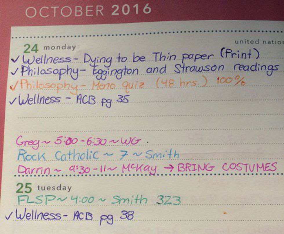 If I don't write something down in my planner, I will literally forget it exists, so I tend to keep it as organized as possible to prevent any confusion. I've been using this adorable 2016-2017 planner from Walmart religiously all semester. It provides a month-at-a-glance view as well as a week-at-a-glance view. On the month-at-a-glance pages, I only write big events, like my dance concerts, exams and due dates for papers. On my week-at-a-glance pages, I write the fine details, like my homework and rehearsals for each day, as well as meetings and the big events from my month-at-a-glance page. I'm also very careful to write down all of my exams and due dates for every single class. I often flip through my planner before class to refresh my memory, and it helps to have that reminder of a paper that's due next week. Then I can write in my planner to get started, get finished or anywhere in between. Some people need a planner that's a little more in-depth than what I use, and others don't need as many reminders. Regardless, planners are an awesome way to not only manage time, but also to stay on top of your assignments. Oh, did I mention I color-code my planner? Let me elaborate on that.