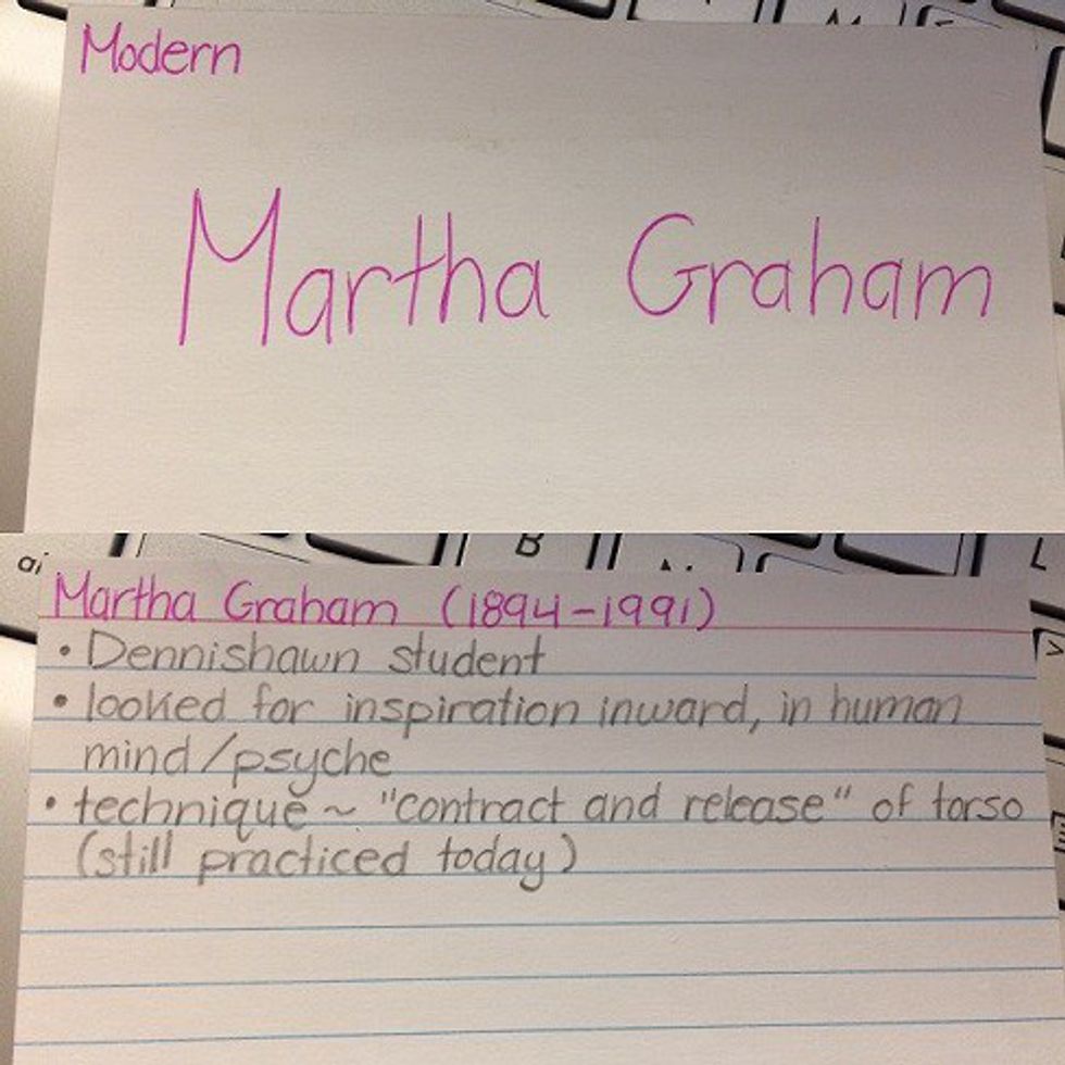 Note cards are nifty little things with many uses. I'm currently working on two research papers, thank goodness I had to write one every year of high school because it was great practice. I like to use note cards to write down quotations that I find in my sources. When I'm typing my research paper, I find that it's a lot easier to pull out a note card when I need a quotation instead of searching through a book or journal. Another way I use note cards is for making flashcards. I just had an Intro to Dance exam on various dance genres ranging from court ballet to musical theater. To study, I made flashcards based on my notes (because I take way too many) and the study guide that my professor uploaded. Making flashcards was a great way to organize all the information, and differentiate between different techniques and dancers. The beauty of flashcards is you're studying when you make them and while you use them. Talk about killing two birds with one stone!