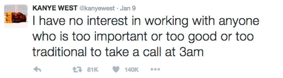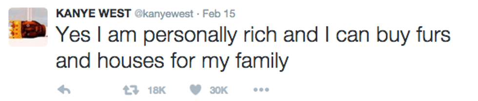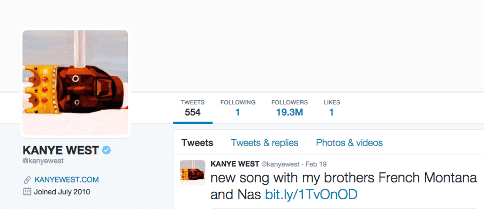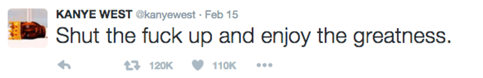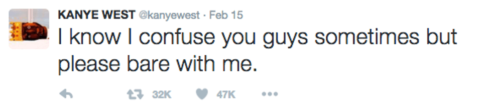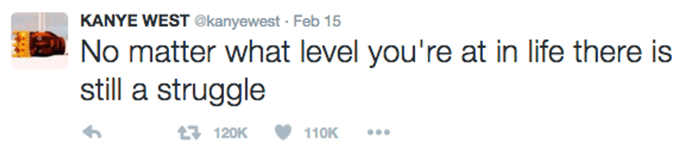I'm going to start off by saying I literally never know what Kanye is talking about and I do not do a good job at "Keeping up with the Kardashians." I have no idea who "Yeezy" is or why two people would name their child "North West" (that just seems mean). But I decided to check out Kanye's Twitter to see what everyone is freaking out about all the time and I must say, he can be a pretty inspirational dude. So please join me on this journey through the @kanyewest Twittersphere.