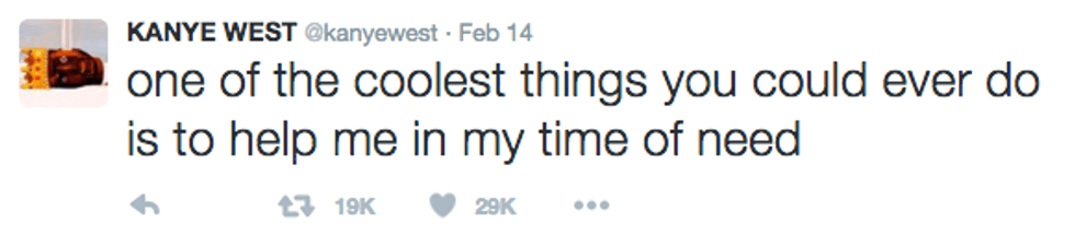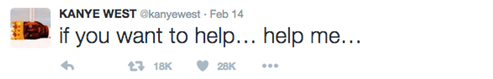 I was low-key going to make a joke about how all his tweets kind of sound like cries for help, but this one just honestly seems like he needs help. #savekanye