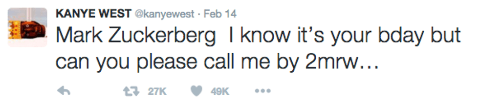 I only ask because it's Valentine's Day still and Kanye is putting the moves on Mark Zuckerberg. Though it is really nice to know that he respects birthdays.